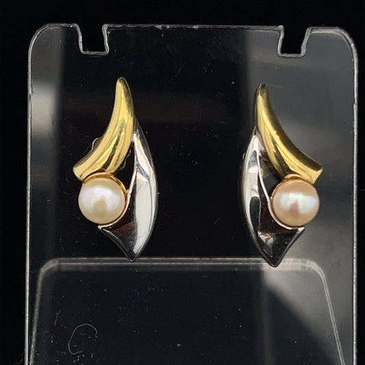 Estate 14K Two Tone White and Yellow Gold Post Earrings with Natural Pearls
