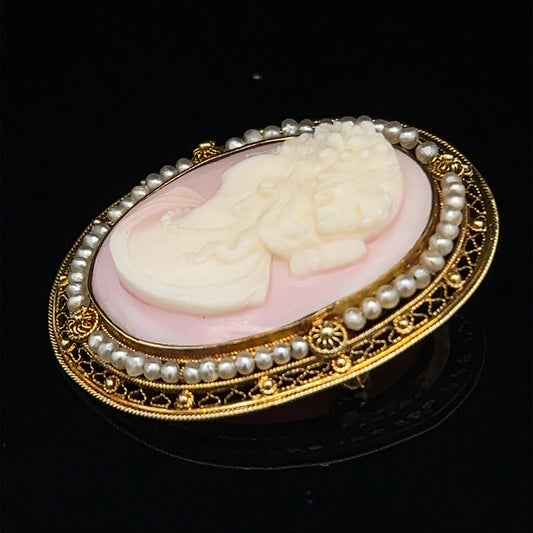 Estate Vintage 14K Yellow Gold Cameo Shell Brooch Pin with Seed Pearls