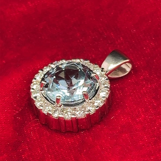 Estate 14K White Gold Round Natural Diamond and Blue Topaz Pendant Necklace Halo Style